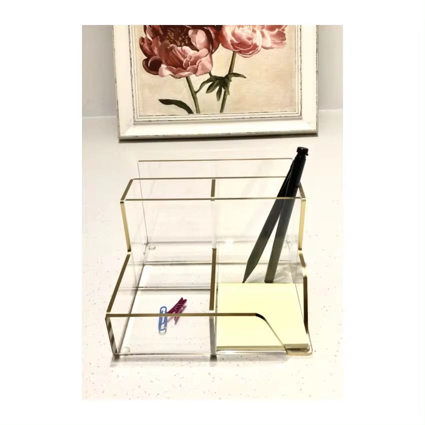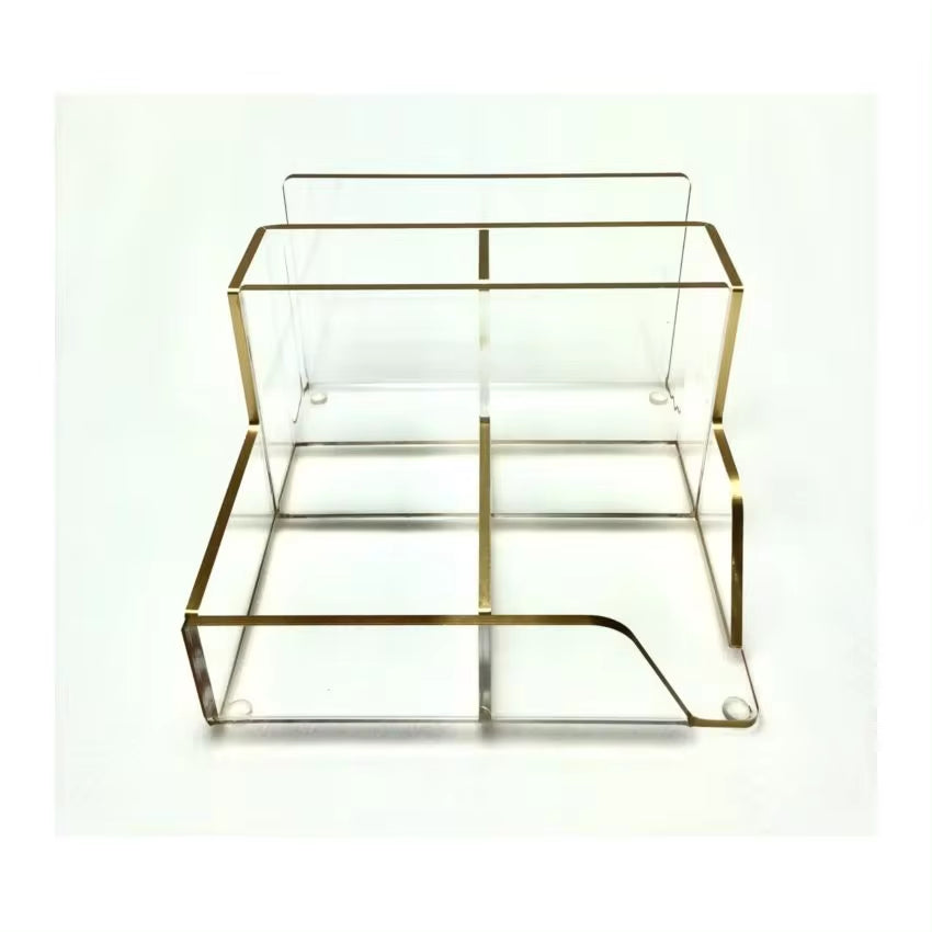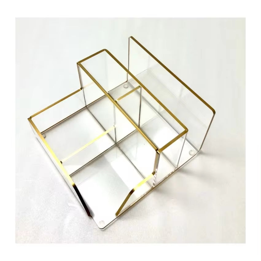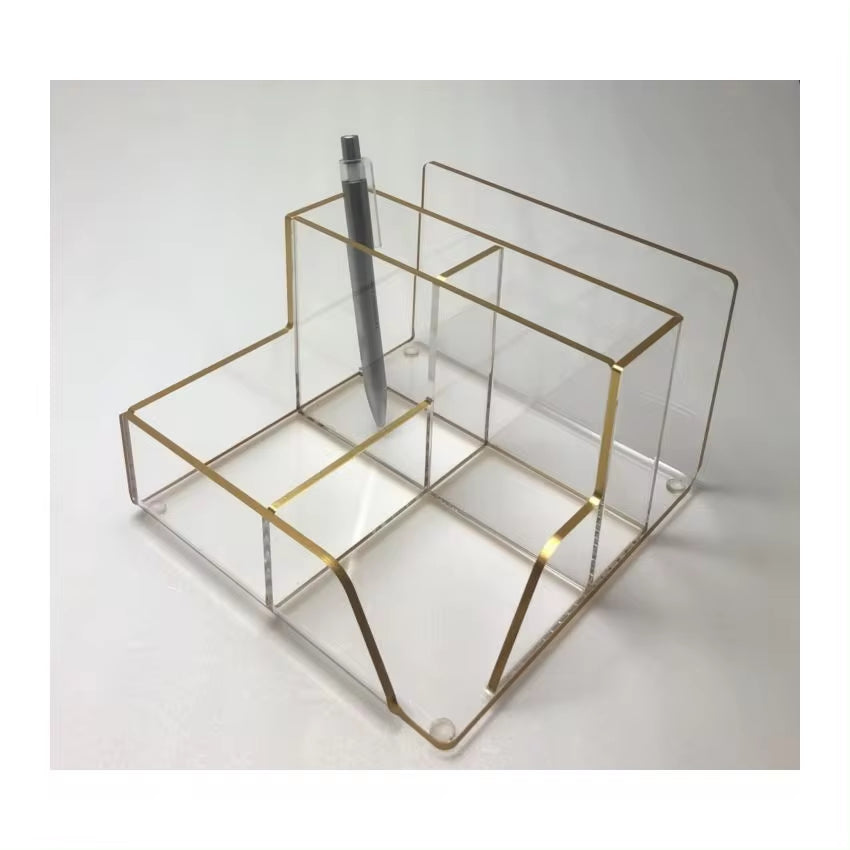 Manufacturer Wholesale Acrylic Office Supplies Desk Organizer Gold Edges Stationery Set is a must-have for any office or workspace. This desk organizer is not only functional but also adds a touch of elegance with its gold-edged design. It is made of high-quality acrylic material, making it durable and long-lasting. The size of the organizer is 16.5 x 17 x 10.5 cm H, providing ample space to store and organize your stationery items such as pens, pencils, scissors, and more. The transparent clear color combined with the gold, rose gold, or silver edges gives it a sleek and modern look. The desk organizer is eco-friendly and can be used in various settings including home, office, hotel, school, and even as a promotional gift. It is customizable with your own logo, making it a great option for branding purposes. The packaging can be customized to suit your needs. With a minimum order quantity of 1000 sets, this desk organizer is perfect for bulk orders. The manufacturer, Giant Up Acrylic Co., Ltd., has over 35 years of experience in manufacturing acrylic products and is known for their fashion, innovation, and quality. They offer OEM and ODM services, allowing you to create unique designs. With their strict quality control system and fast response to problems, you can trust the quality and speed of their products. Upgrade your workspace with this stylish and functional desk organizer.