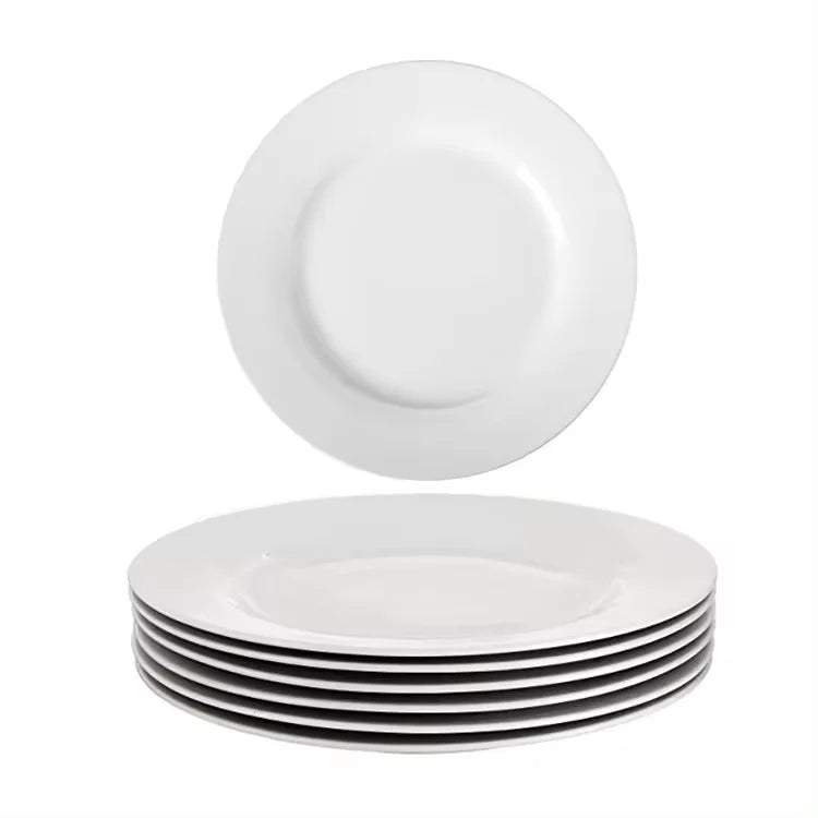 Introducing our 10.5 Inch Ready to Ship Bulk Flat White Porcelain Dishes round Dinner Plates Ceramics for Restaurant Wedding Hotel. These elegant and versatile dinner plates are perfect for any occasion, whether it's a restaurant, wedding, hotel, or party.